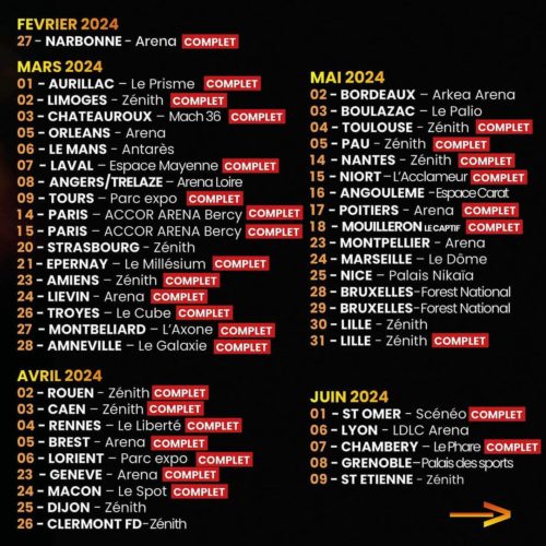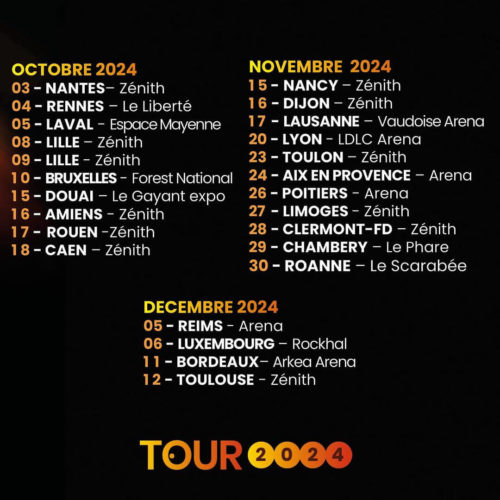 Ycare a assuré la première partie du concert à l’Accor Arena (Paris Bercy) le 14 mars, suivi par le petit nouveau qui monte, Joseph Kamel, qui a pris le relais le 15 mars. Ycare est également prévu en ouverture pour le concert du 5 juillet 2024 au Festival de Nîmes.