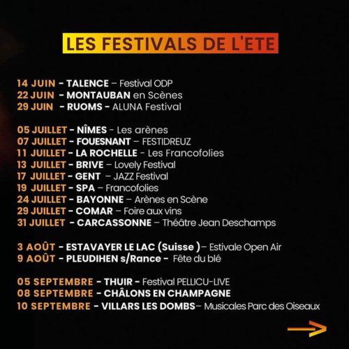 Une tournée d’été au cœur des festivals a été programmée puis la reprise de la tournée à l’automne, avec une nouvelle série de dates pour un 2ème passage dans des villes comme Nantes, Rennes, Lille, Lyon ou encore Bordeaux qui ont vite été « sold out » au lancement de la billetterie !